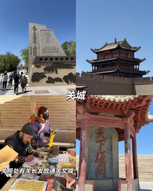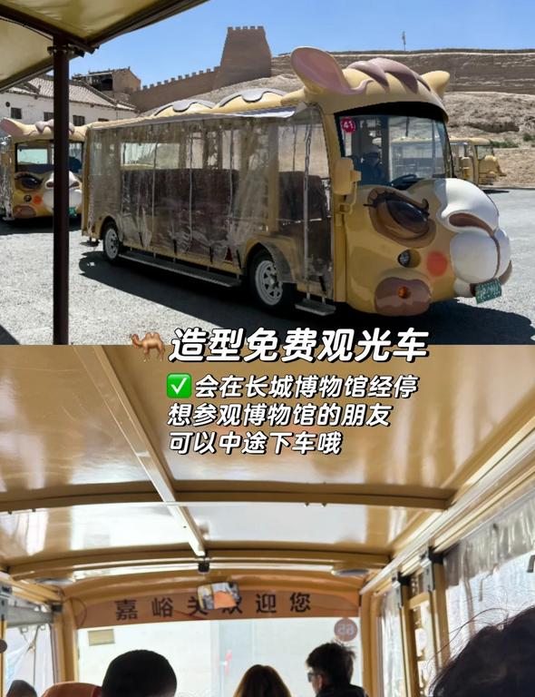 检票后可乘坐造型为🐫的观光车前往关城门口。🧭 观光路线包括:东闸门、碑廊、文昌阁、关帝庙、柔远门、游击将军府、光化门、关照、会极门,最后到达嘉峪关门。🌟 在关照处可以办理通关文牒,非常适合带小朋友体验。还可以寻找西瓮城门楼后檐台上的“定城砖”,从这里能欣赏到祁连山和黑山的壮丽风景。