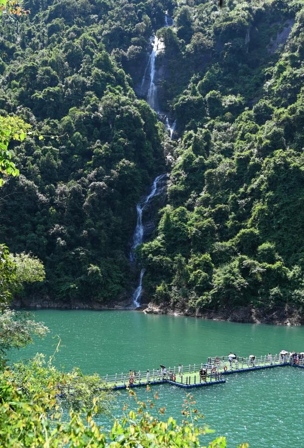龙景峡谷位于码头附近。这里有两条游览线路,一条是攀登山峰,山顶有瀑布,但由于我们感到疲惫,最终选择不爬山。另一条则是沿着栈道和浮桥走,很快便能完成游览。游览结束后,我们乘坐景区大巴直接返回到入口处。