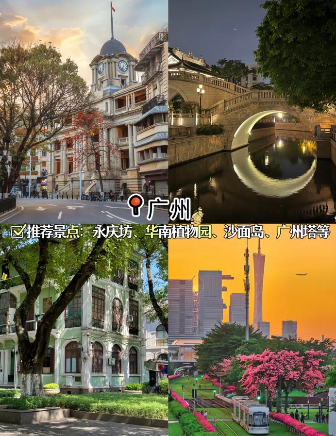 📍推荐景点:白云山、永庆坊、华南植物园、沙面岛、广州塔、北京步行街等