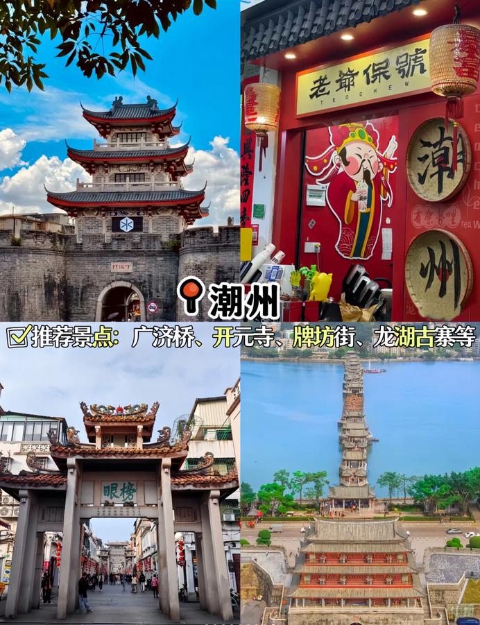 📍景点推荐:广济桥、开元寺、牌坊街、潮州功夫茶体验馆、龙湖古寨等
