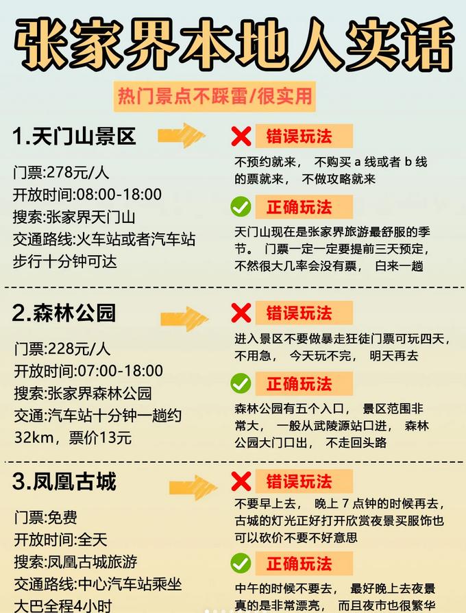 ➡ 住宿:在张家界可以选择市区或武陵源区的住宿。如果计划游览凤凰古城,可以在当地过夜,这样会更加方便
