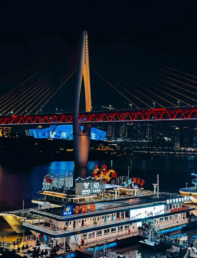 📸 千厮门大桥:在桥中段或对岸(大剧院方向)拍摄全景,灯光与倒影的效果令人惊艳!