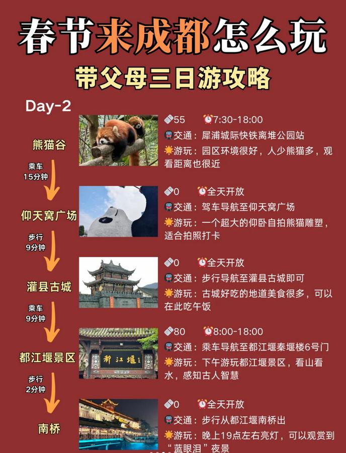 📝三天的行程中,建议留出两天去都江堰,欣赏自然山水、看熊猫、了解历史水利工程,这些景点适合各个年龄段的游客