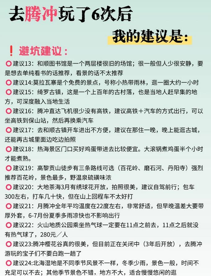 腾冲是一个非常值得游玩的地方,但在出发之前一定要做好充分准备,以免遇到不必要的问题😭。这篇攻略将为您提供腾冲的景点、交通、住宿、美食以及一些实用的避雷建议,内容丰富,建议有计划的朋友提前了解一下🐴,以免到时手忙脚乱💕。 …