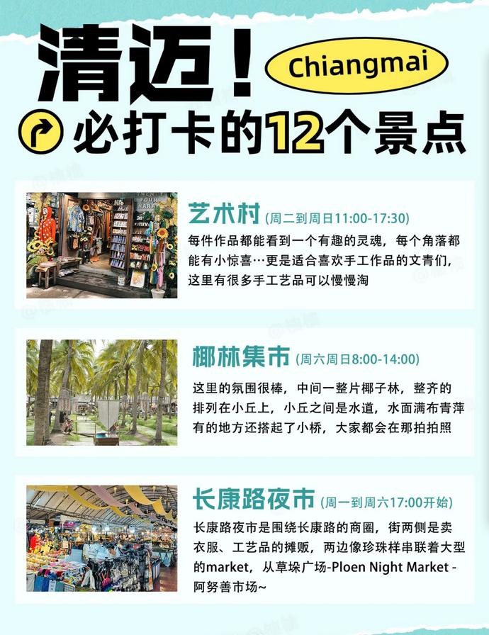 💛两天游推荐:若有充足时间,建议将行程延长至两天,游览清迈大学、大学夜市、宁曼路等地,这些地方不仅富有文化底蕴,还有美味的小吃可供品尝。