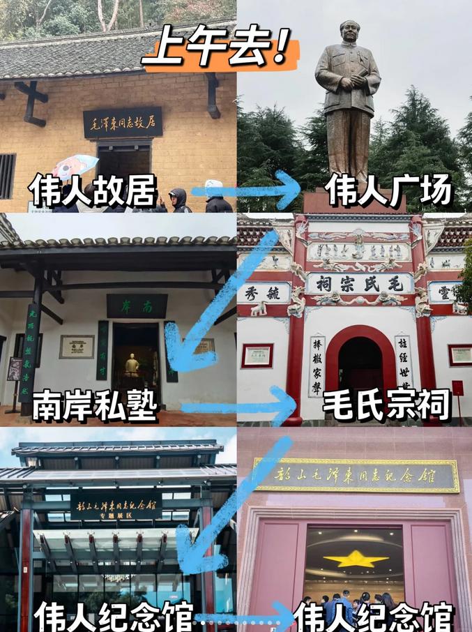 ✔️爷爷故居➡️爷爷铜像广场➡️南岸私塾➡️毛氏宗祠➡️伟人纪念馆(生平展区)➡️爷爷纪念馆(展区)