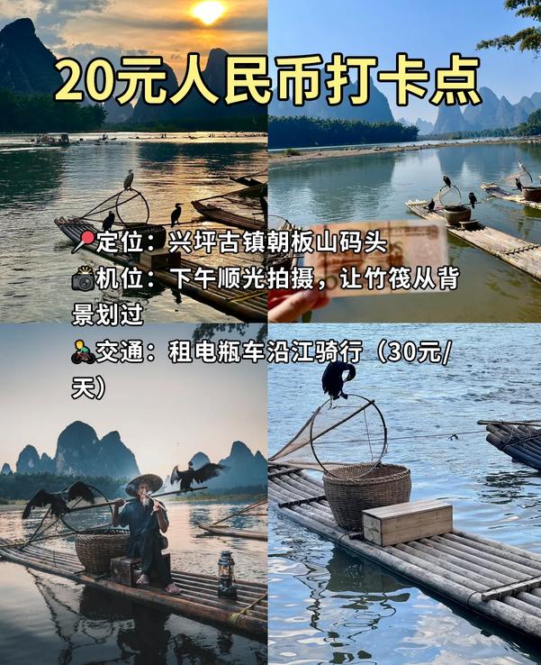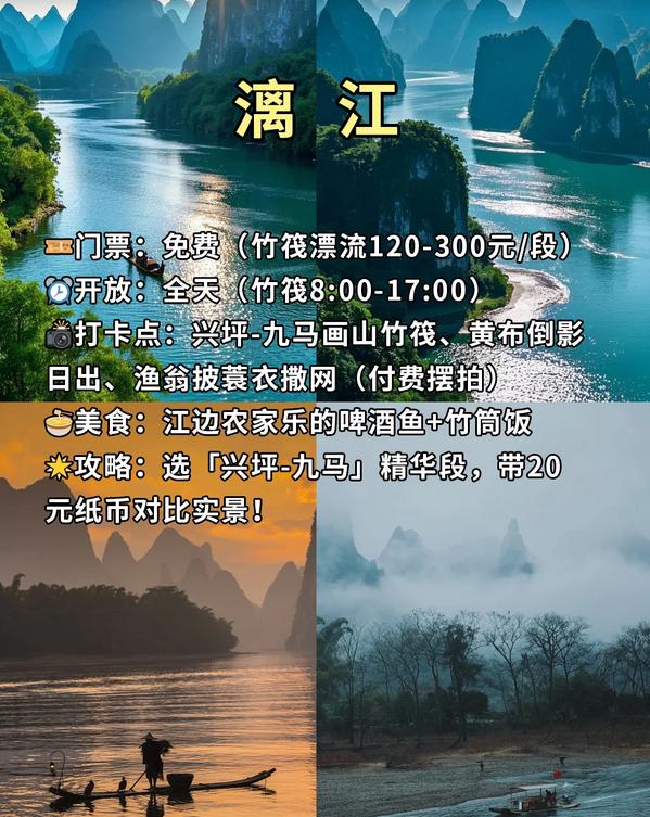 📸推荐拍摄点:兴坪-九马画山竹筏、黄布倒影日出、渔翁披蓑衣撒网(付费摆拍)