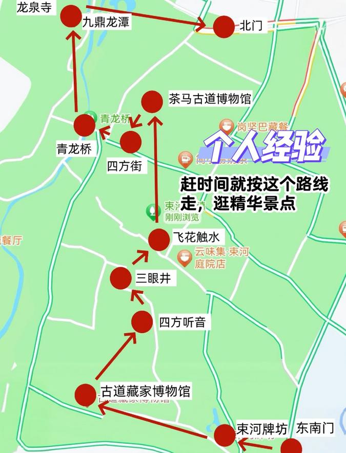 东南门-束河牌坊-古道藏家博物馆-四方听音-三眼井-飞花触水-茶马古道博物馆-四方街-青龙桥-九鼎龙潭/龙泉寺-北门-(可在北门口搭乘公交前往白沙古镇)