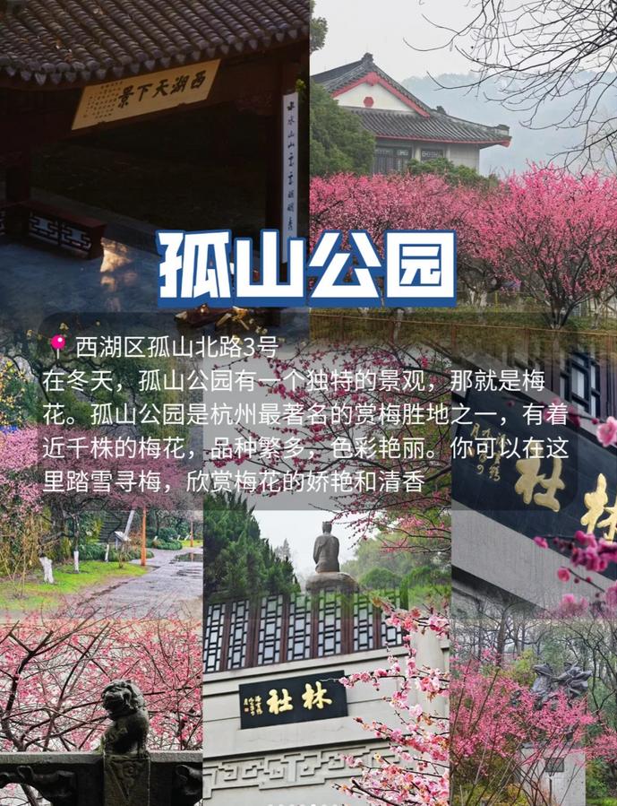 冬季的孤山公园展现出独特的梅花景观。作为杭州最受欢迎的观梅地点之一,这里栽种了近千株梅花,种类繁多,色彩鲜艳。在这里,您可以踏雪寻梅,领略梅花的美丽与芬芳。