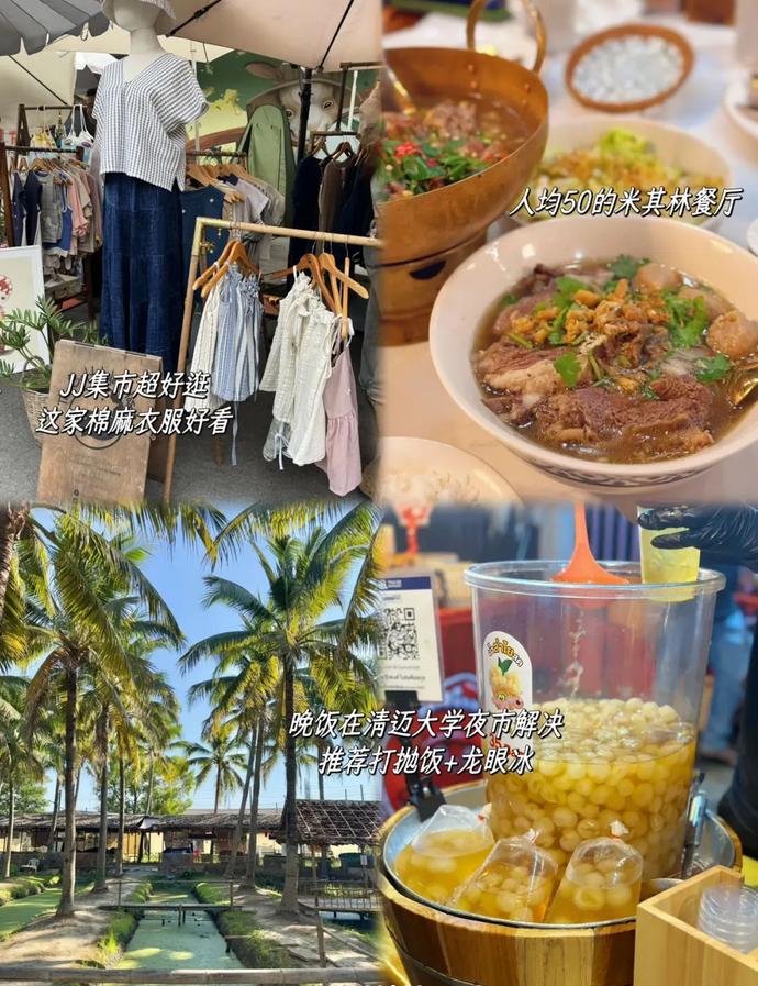 下午搭车去📍椰林集市,拍了椰子树的照片,晚餐在📍清迈大学夜市解决,推荐尝试打抛饭和龙眼冰。