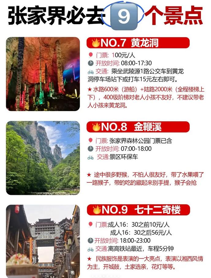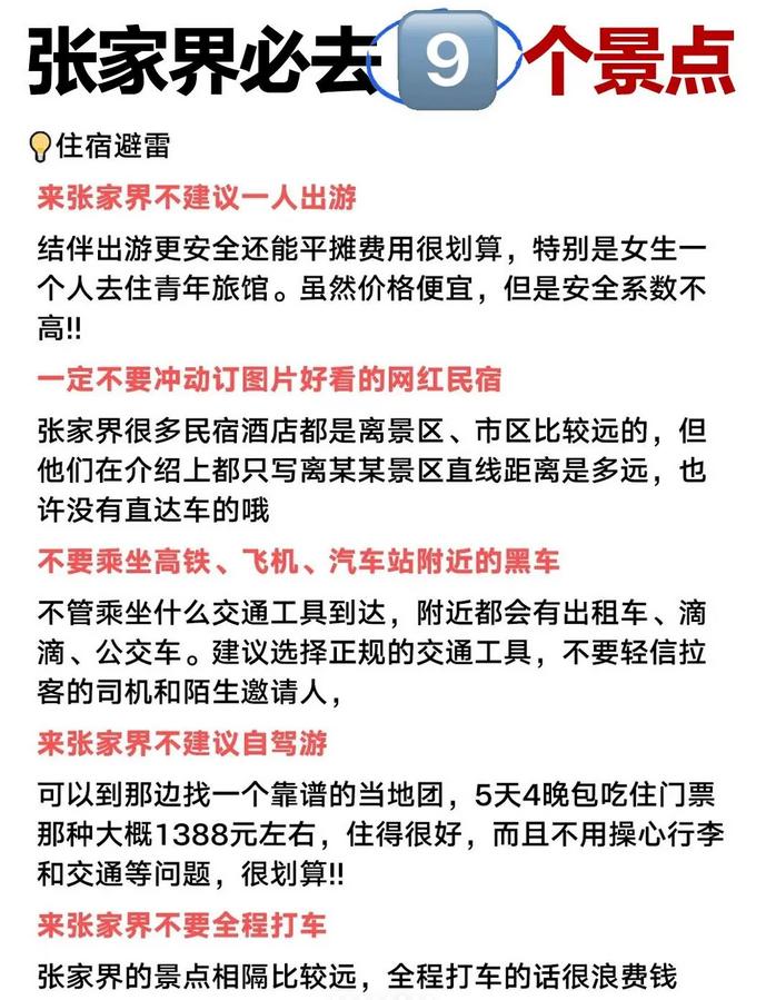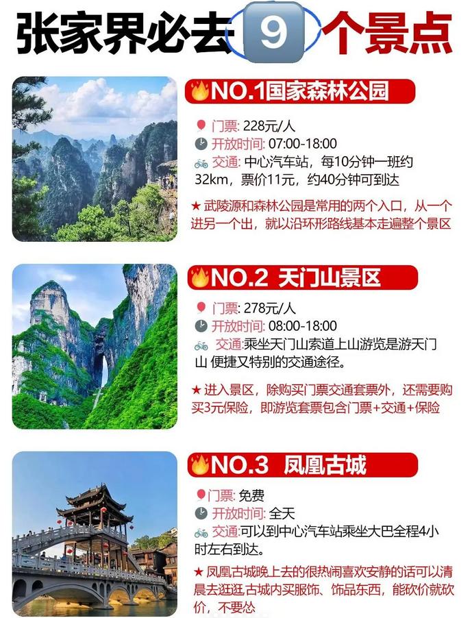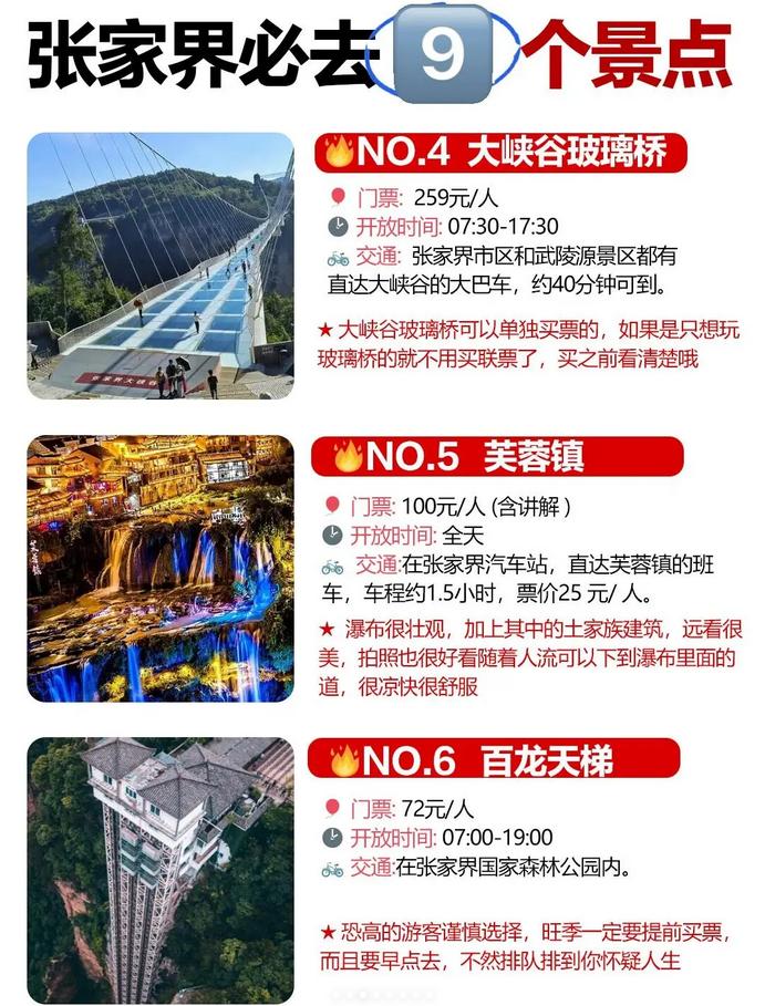 ✨在张家界暑期蚊虫较多,建议携带防虫用品。请勿理会无证导游的拉客行为,避免在景区路边摊购买银器和特产等商品。