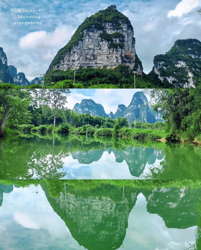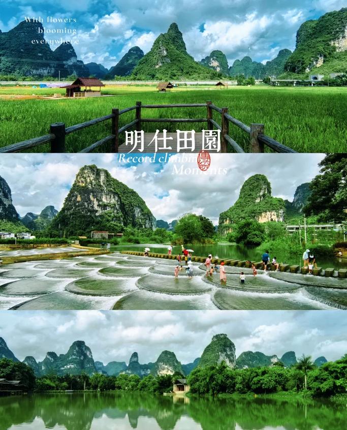 即使我曾经去过桂林,明仕田园的自然风光依然令人惊叹。特别是在阳光明媚的日子里,连绵的山峦和漂浮的云朵在水面上的倒影美得让人陶醉,真的感觉怎么拍都拍不够。此外,清晨的鸭群也显得格外迷人,它们在竹筏的引领下悠然游动,确实让人感受到大自然的魅力。