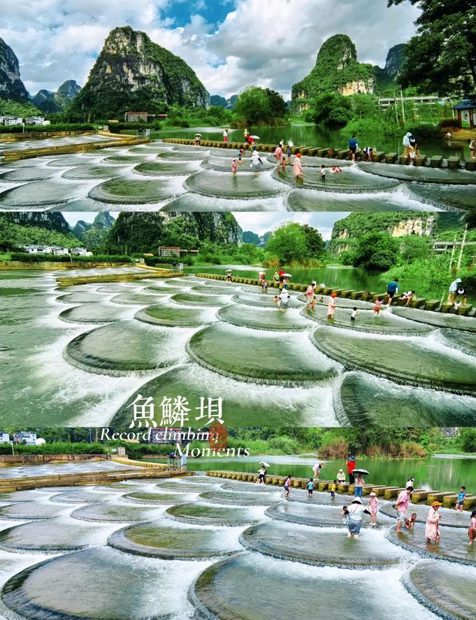 终于亲眼见到了在小红书上看了无数遍的鱼鳞坝。同行的朋友也有相同的感受——似乎没有照片上看起来那么宏伟!我迫不及待地脱掉鞋袜,冲了进去。