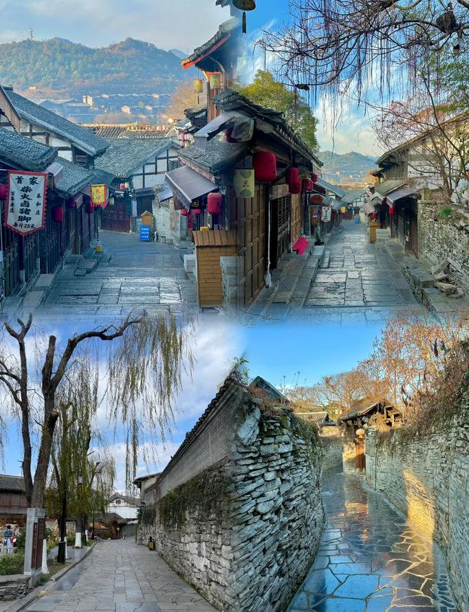古镇坐落于山水之间,青石板路曲折蜿蜒,房屋错落有致,展现出古朴典雅的风貌。
