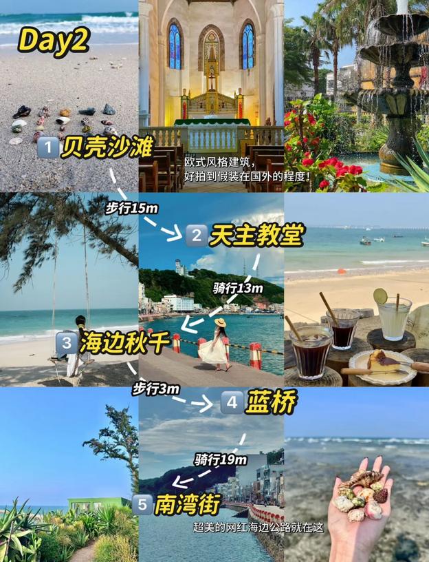 👉 游览路线:贝壳海滩→天主教堂→海边秋千→蓝桥→南湾街日落
