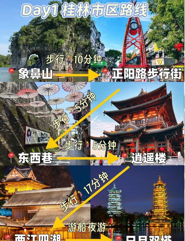 第一天:象鼻山➡️正阳路➡️东西巷➡️逍遥楼➡️两江四湖➡️日月双塔
