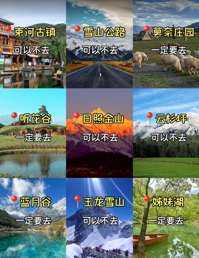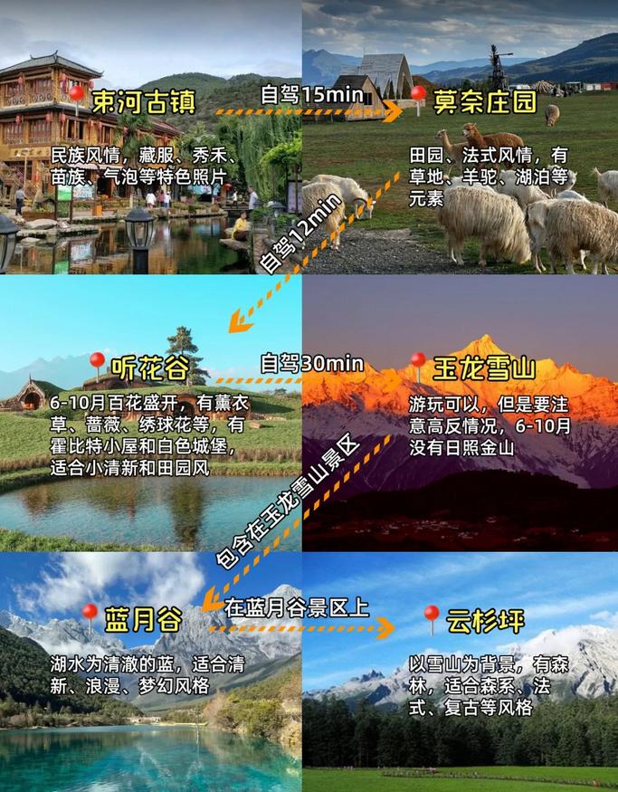 1.蓝月谷:湖水呈现Tiffany蓝色,搭配雪山背景,建议上午拍摄,光线柔和