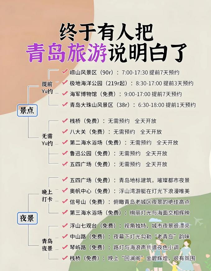 - 海鲜市场:注意可能存在的缺斤少两现象,建议选择标价清晰的店铺。青岛的浪漫隐藏在海风与街角的老建筑中,2025年新增加的科技体验更值得一探!你最想去哪里打卡呢?欢迎在留言区分享~