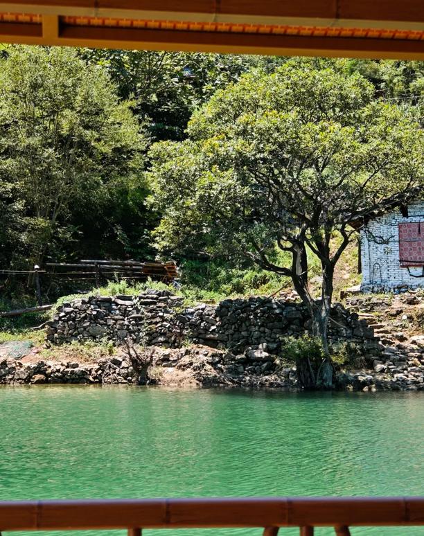在村口会有一个小卖部,唐师傅提供趟船服务,费用为50元。前一天可以到达,从3号到4号打卡点之间,竹筏会经过一片树下,那里有两头牛在吃草。