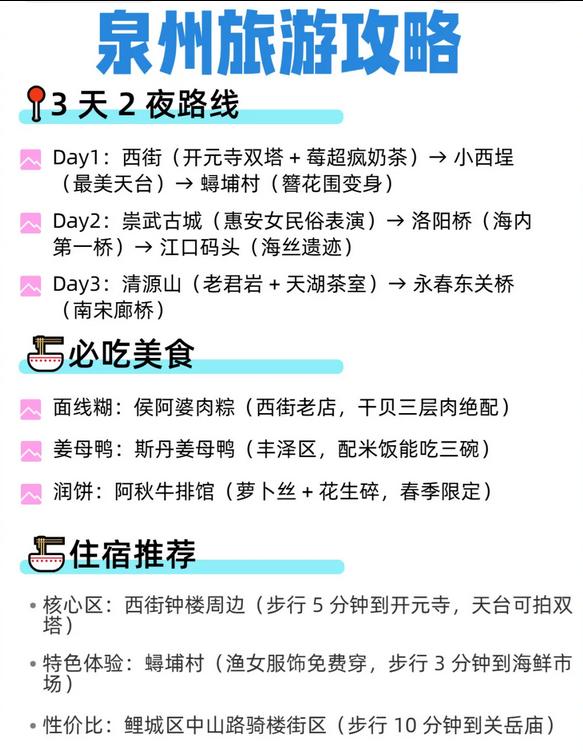 🔹 泉州:西街享受面线糊,蟳埔村欣赏变身渔女的表演|推荐侯阿婆肉粽|住宿在西街钟楼附近(天台可拍双塔夜景)