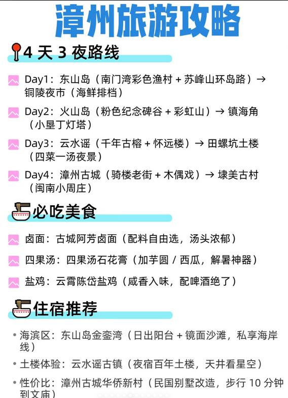 🔹 漳州:在东山岛南门湾放空心情,云水谣欣赏土楼夜景|推荐古城阿芳卤面|住宿建议金銮湾(享受镜面沙滩)