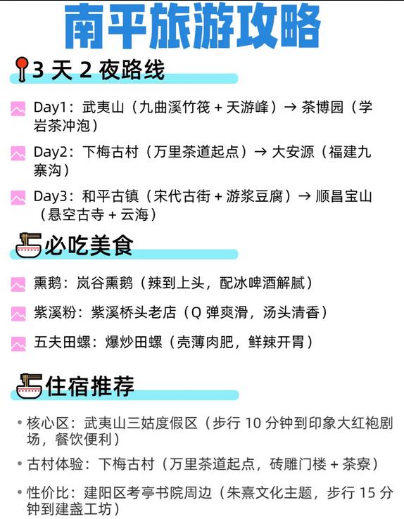 🔹 南平:武夷山体验竹筏漂流,下梅古村探寻茶道|推荐岚谷熏鹅(搭配冰啤酒)|住宿在三姑度假区(靠近印象大红袍)