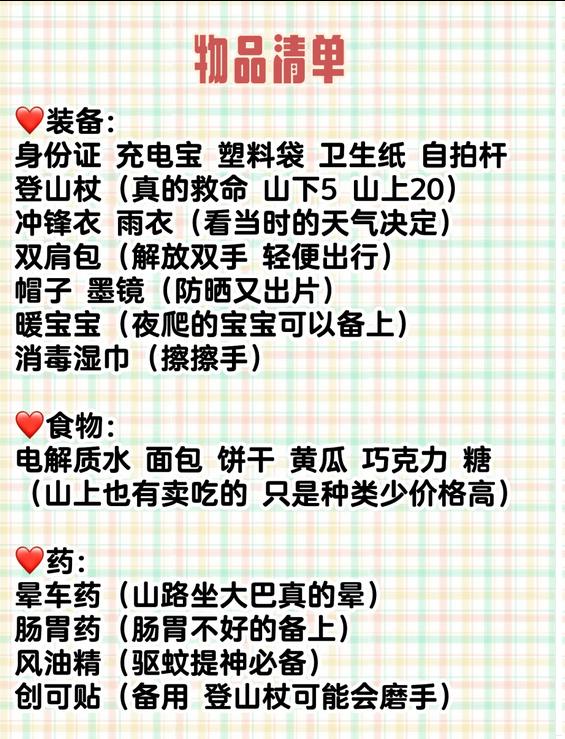 身份证 充电宝 登山杖 卫生纸 自拍杆 塑料袋 冲锋衣 雨衣 双肩包 帽子 墨镜 暖宝宝 电解质水 面包 饼干 黄瓜 巧克力 糖 晕车药 肠胃药 风油精 创可贴