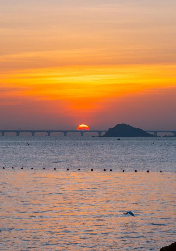 海豚湾沙滩日落:傍晚时分,橘红色的天空映照在海面上,建议坐在沙滩秋千上捕捉美丽的剪影。