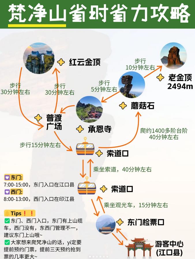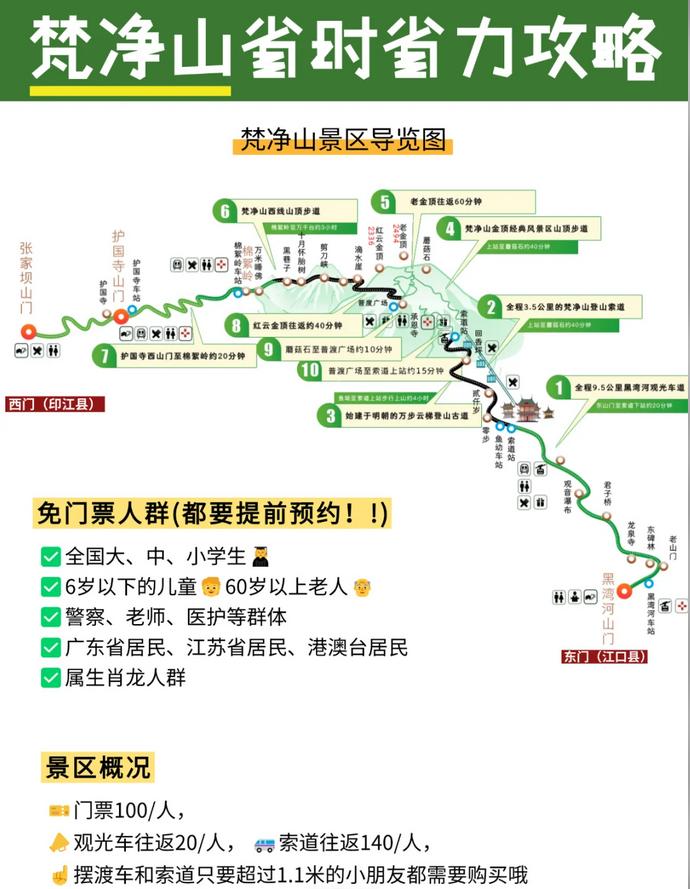 2️⃣ 购票前需要明确从哪个入口进入和出口,进出必须遵循所购票的规定。东门与西门相距较远,东门有索道,而西门则需要徒步进出,因此西门只能步行,东门则可选择索道或徒步。