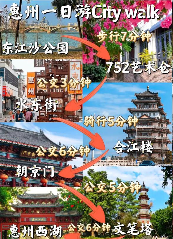 东江沙公园→752艺术仓→水东街→合江楼→朝京门→文笔塔→惠州西湖