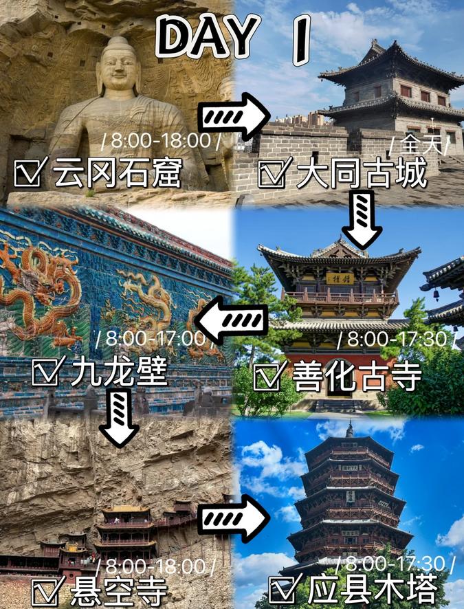 DAY1 从大同出发-游览云冈石窟-大同古城-善化寺-九龙壁-悬空寺-应县木塔-享用晚餐并住宿在应县