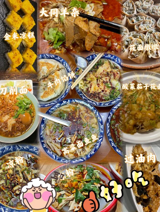 美食:大同刀削面、羊杂、莜面、凉粉、金米凉糕、高粱米鱼等各种面食都非常美味。