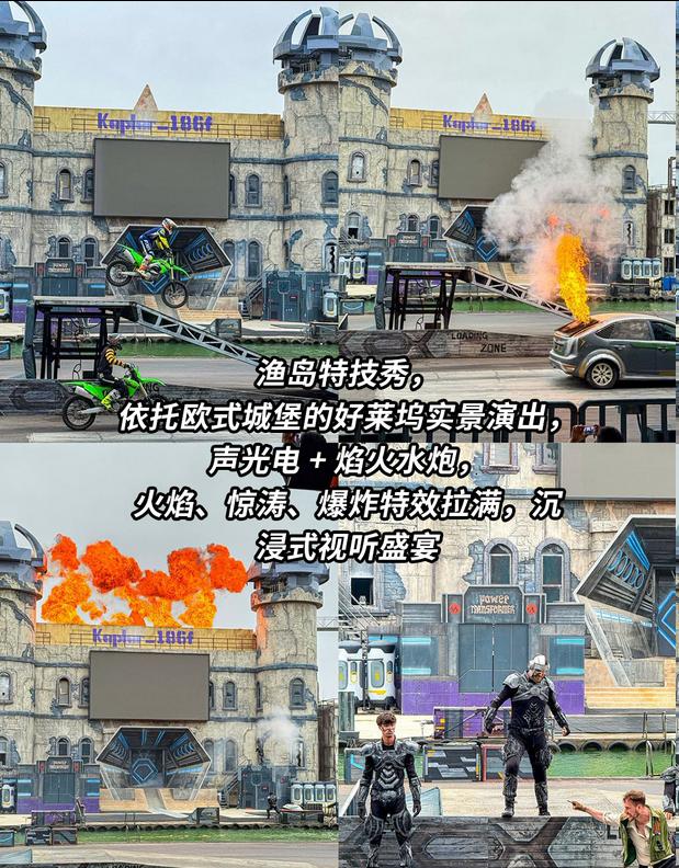 3⃣ 渔岛夜秀不可错过:好莱坞特技表演🔥,城堡爆炸与火焰飞扬,现场刺激程度十倍于电影!