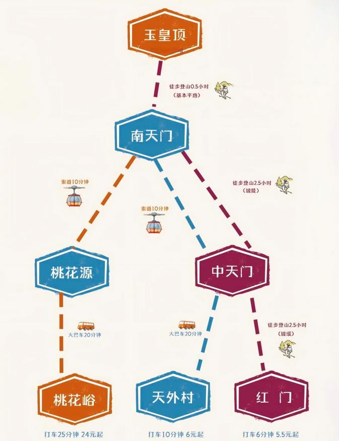 🚠桃花峪的行程安排是:首先乘坐大巴,然后搭乘索道,接下来步行0.5到1小时即可抵达山顶。
