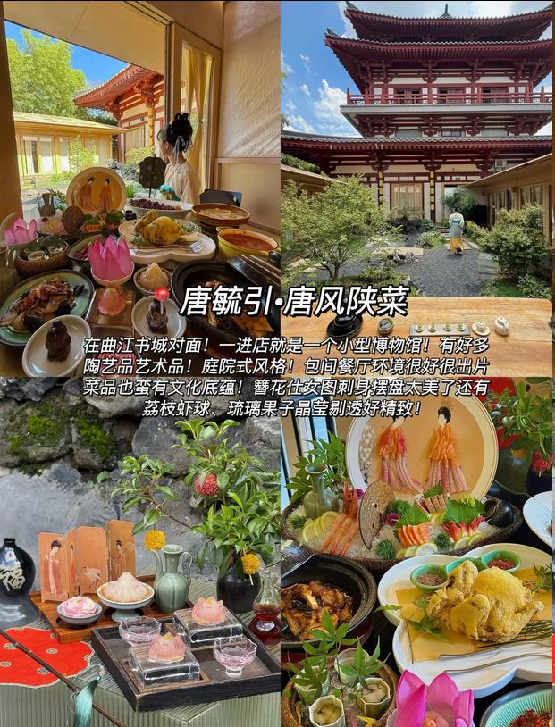 至于正餐!!来到西安必尝当地特色餐厅!在小红书上看到的这家唐毓引•唐风陕菜!它位于大唐芙蓉园旁边,进门就像走进了一个小博物馆!这里有很多陶艺作品和艺术品,唐风庭院的风格让人心旷神怡!环境非常适合拍照!菜品的摆盘如同簪花仕女图般美丽!还有荔枝虾球、琉璃果子晶莹剔透,精致得令人惊叹!唐风茶点也值得一试!这家餐厅绝对是值得打卡的好去处!!