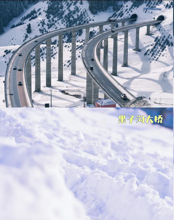 果子沟大桥是必去的打卡地,雪山与大桥的组合背景让人瞬间拍出大片效果!
