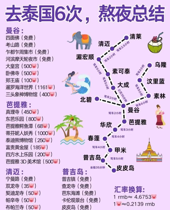 6️⃣入境须知:泰国对中国游客实行免签,入境时一般不会询问太多,建议准备好现金、打印的酒店确认单及返程机票。注意,泰国时间比北京时间晚一小时