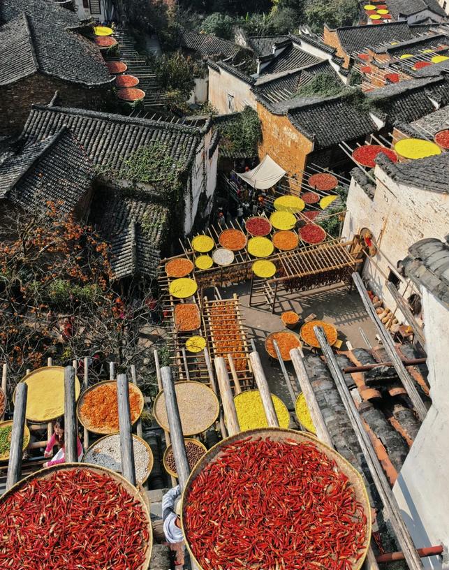 🌾晒工坊:从高处俯瞰整个古村的晒秋全景,这里有三层观景台,每一层都能欣赏到不同家庭的晒秋场景,成为网红拍照的热门地。