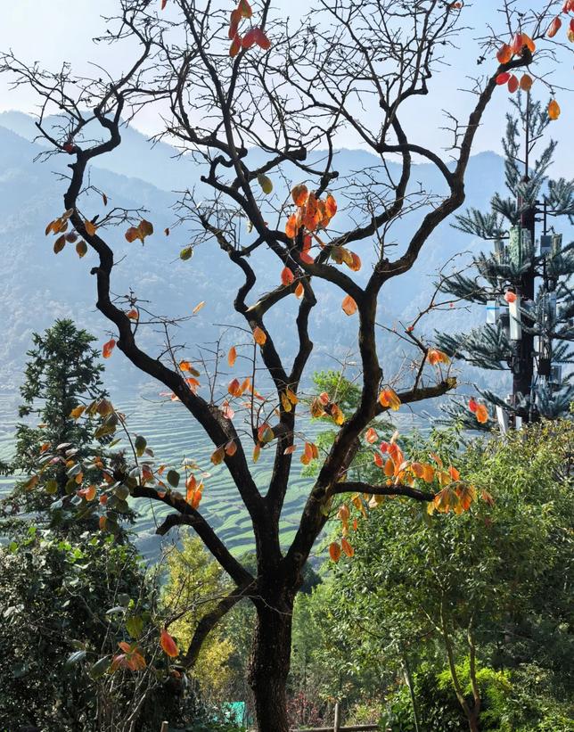 火红的辣椒、金黄的玉米、树枝上挂满的柿子