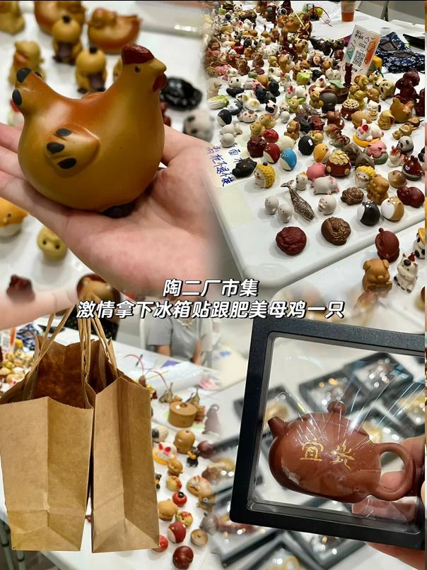 这里出售紫砂手把壶、茶宠摆件以及紫砂壶,均价在20到200元以上。我买了一个超大的肥母鸡摆件,真的超级可爱!