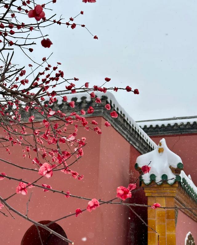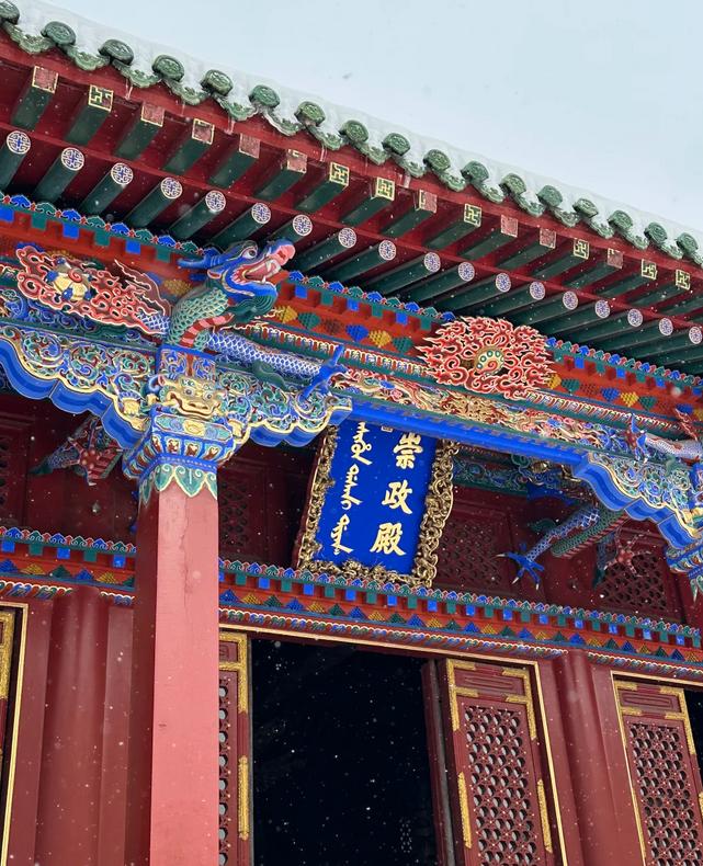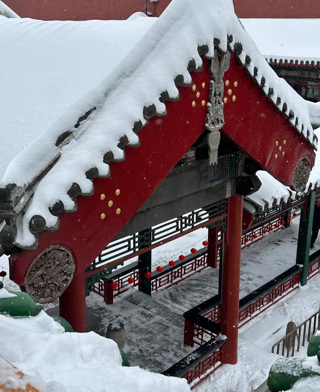 比起北京的故宫,这里少了些拥挤,却多了几分神秘! 红墙与金瓦在雪花纷飞中显得格外迷人