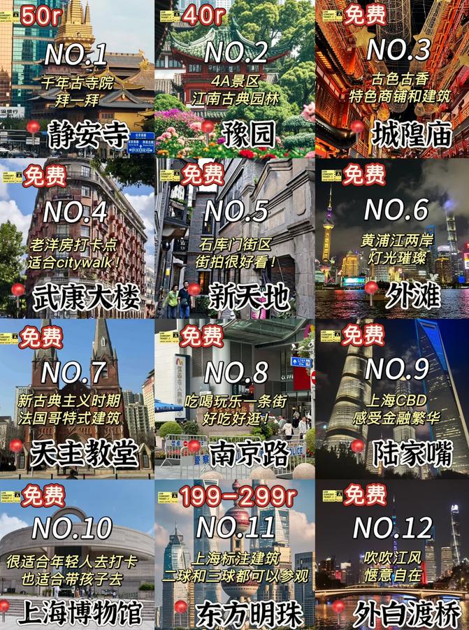 外滩(免费):适合晚上观赏夜景,黄浦江两岸灯光璀璨夺目