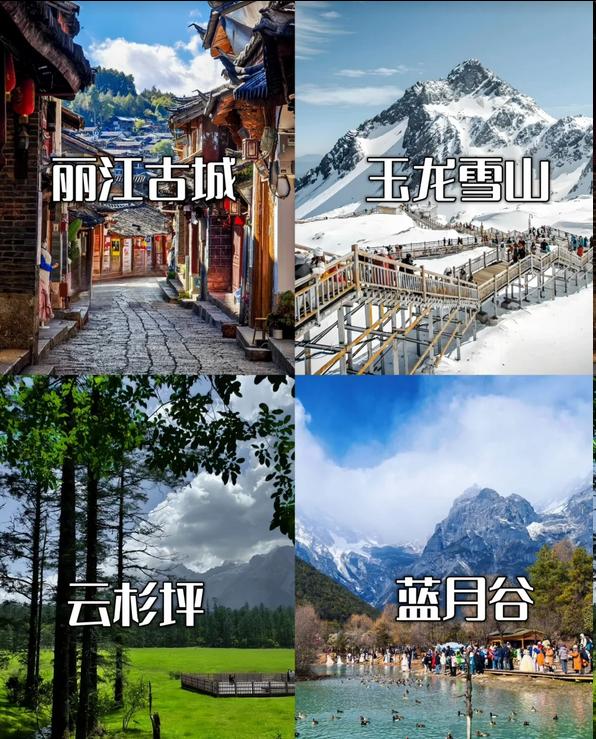 ✅玉龙雪山:提前通过“丽江旅游集团”小程序购买冰川公园的索道票,穿上厚外套,挑战4680米的高度,亲密接触壮丽的冰川,蓝月谷的湖水如梦幻般美丽,拍照效果极佳。