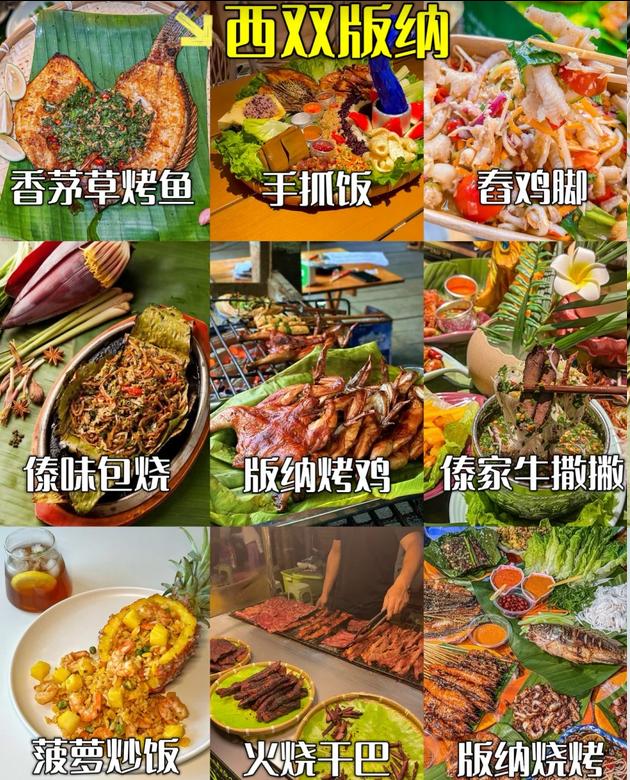 🥘西双版纳:傣味烧烤(香茅草烤鱼必尝)、傣味手抓饭、泡鲁达、舂鸡脚 🎯