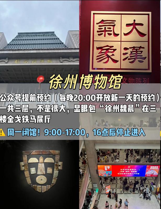 6⃣️徐州博物馆:需通过公众号提前预约(每晚20:00开始新一天的预约),周一闭馆!开放时间为9:00-17:00,16点后停止入馆,三楼有显著的“徐州版魏晨”打卡点