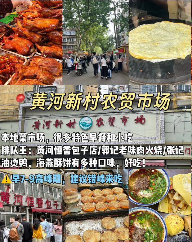 🌟黄河新村农贸市场:提供特色早餐,如黄河恒香包子、张记油烫鸭和海燕烧饼