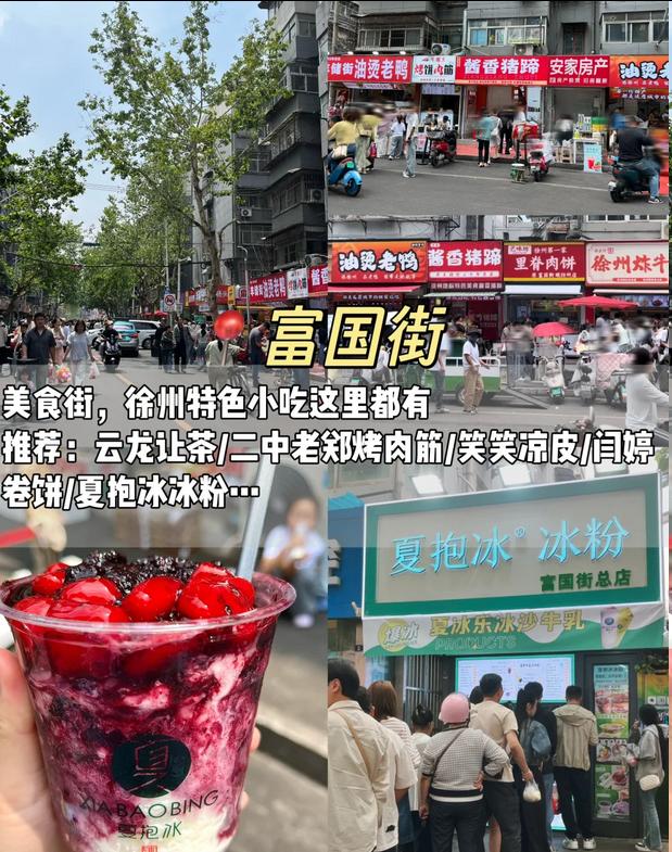 🌟富国街:这里汇聚了徐州的各类特色小吃,包括云龙让茶、二中老郑烤肉筋、笑笑凉皮和夏抱冰冰粉等……