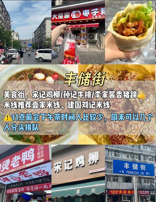 🌟丰储街:推荐的热门美食有宋记鸡柳、孙记牛排和李家酱香猪蹄,另外,壹家米线和建国刘记米线也非常值得尝试!