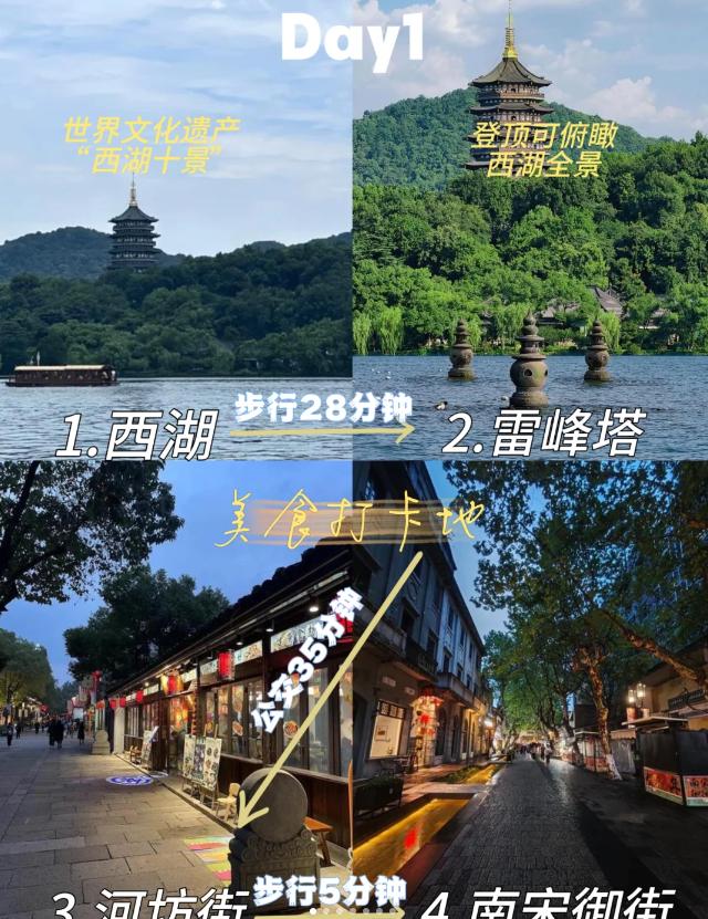 第一天:游览西湖、雷峰塔、河坊街和南宋御街,重点推荐杭州的标志性景点