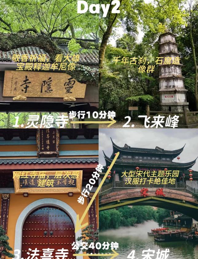 第二天:参观灵隐寺、法喜寺、飞来峰和宋城,享受杭州的山寺风光